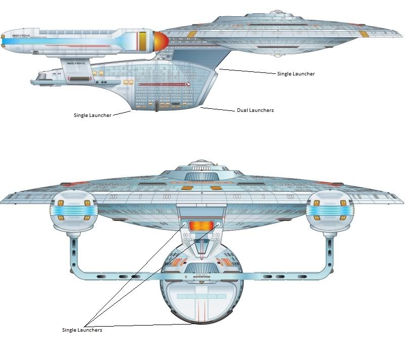If I were to design a Post-Dominion Ambassador, I would add dual Torpedo launchers below, for and aft, the Deflector Dish ala Sovereign Class.  I did notice however that there appears to be no visible aft Torpedo Launcher on the original model.  Perhaps they can go on each side of the Impulse Engine, regardless of Dominion Refit or not?